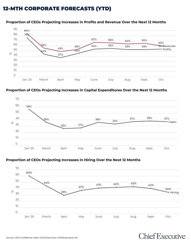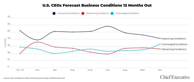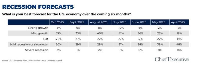 “Uncertainty coupled with fears of a market correction make it tough to foretell an upbeat forecast,” mentioned one CEO within the know-how area. “Nonetheless not clear what impression tariffs, authorities shutdown, lackluster job numbers, continued inflation, lack of immigrant staff and different components may have.”