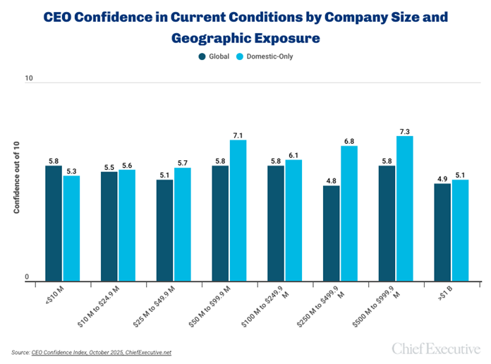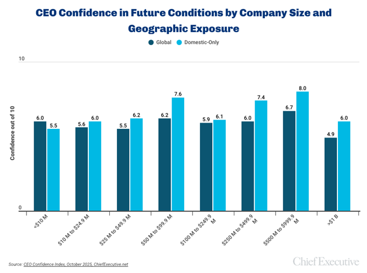 As you’d anticipate, the October knowledge finds companies that function solely within the U.S. typically report better optimism than their friends with world operations. Amongst companies sized $250 million to $500 million, for instance, domestic-exclusive CEOs present a ranking of present circumstances at 6.8 out of 10––42 % increased than those that function globally.