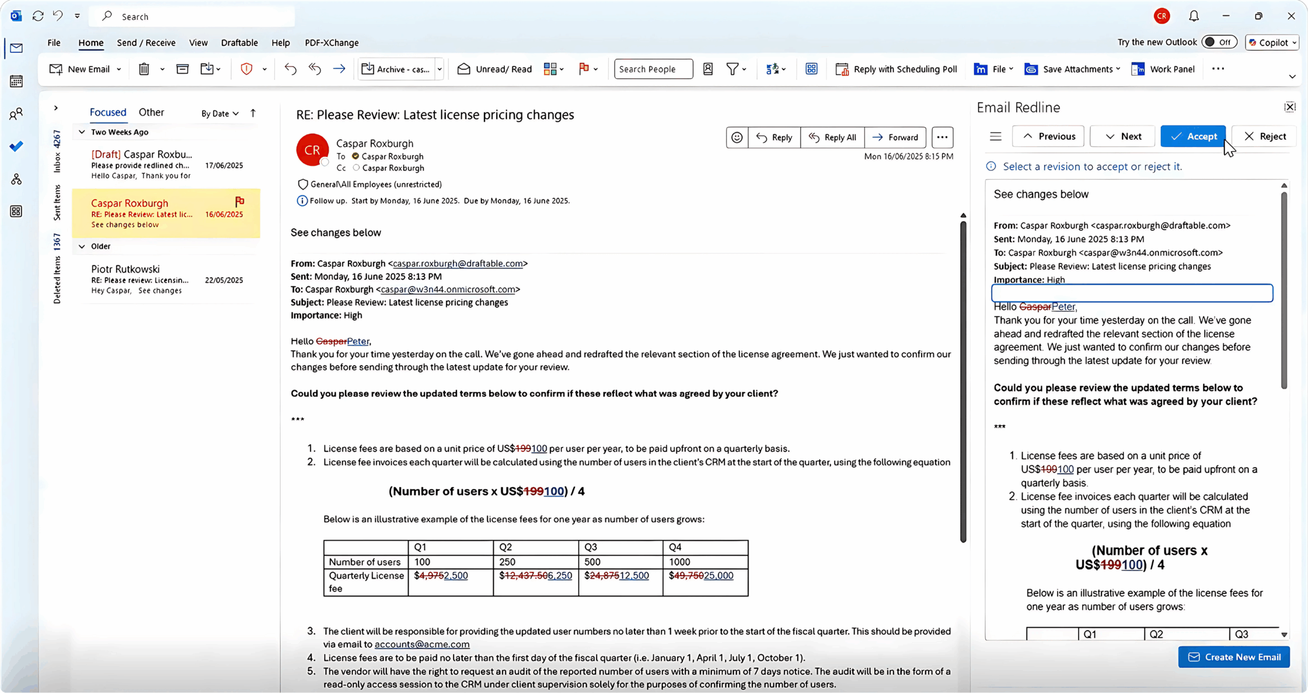 The most recent function most companies are buzzing about—solely launched in Might 2025—is Draftable’s capability to deal with redlines instantly in e mail.
