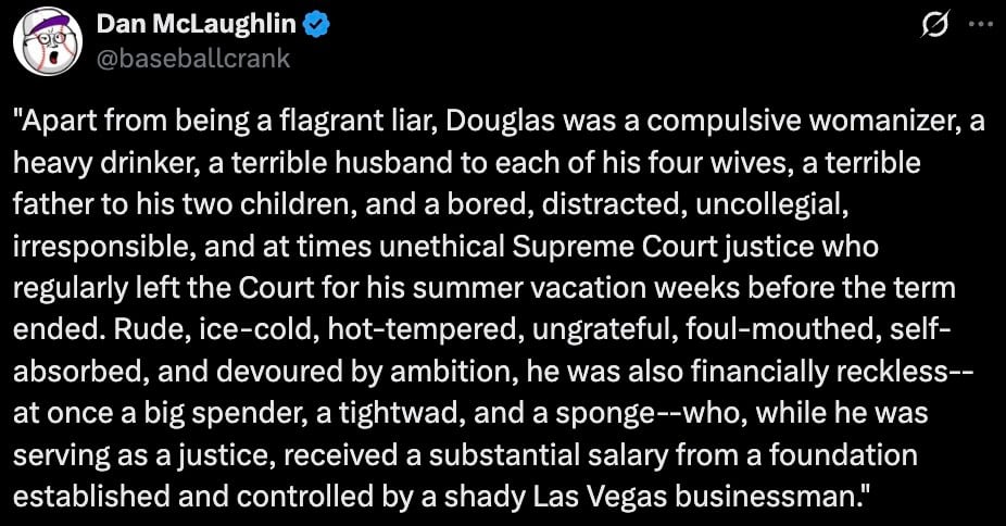 The trail from Kerr’s submit to Neff suggesting The Nice Dissenter ought to change into The Nice Disinterred, ran by way of different right-wing accounts leaping on Douglas’s grave. Nationwide Evaluate’s Dan McLaughlin racked up practically 300K impressions highlighting a passage from Posner’s e-book overview that drips with the form of vitriol McLaughlin usually reserves for increasing the designated hitter rule or girls believing in bodily autonomy.