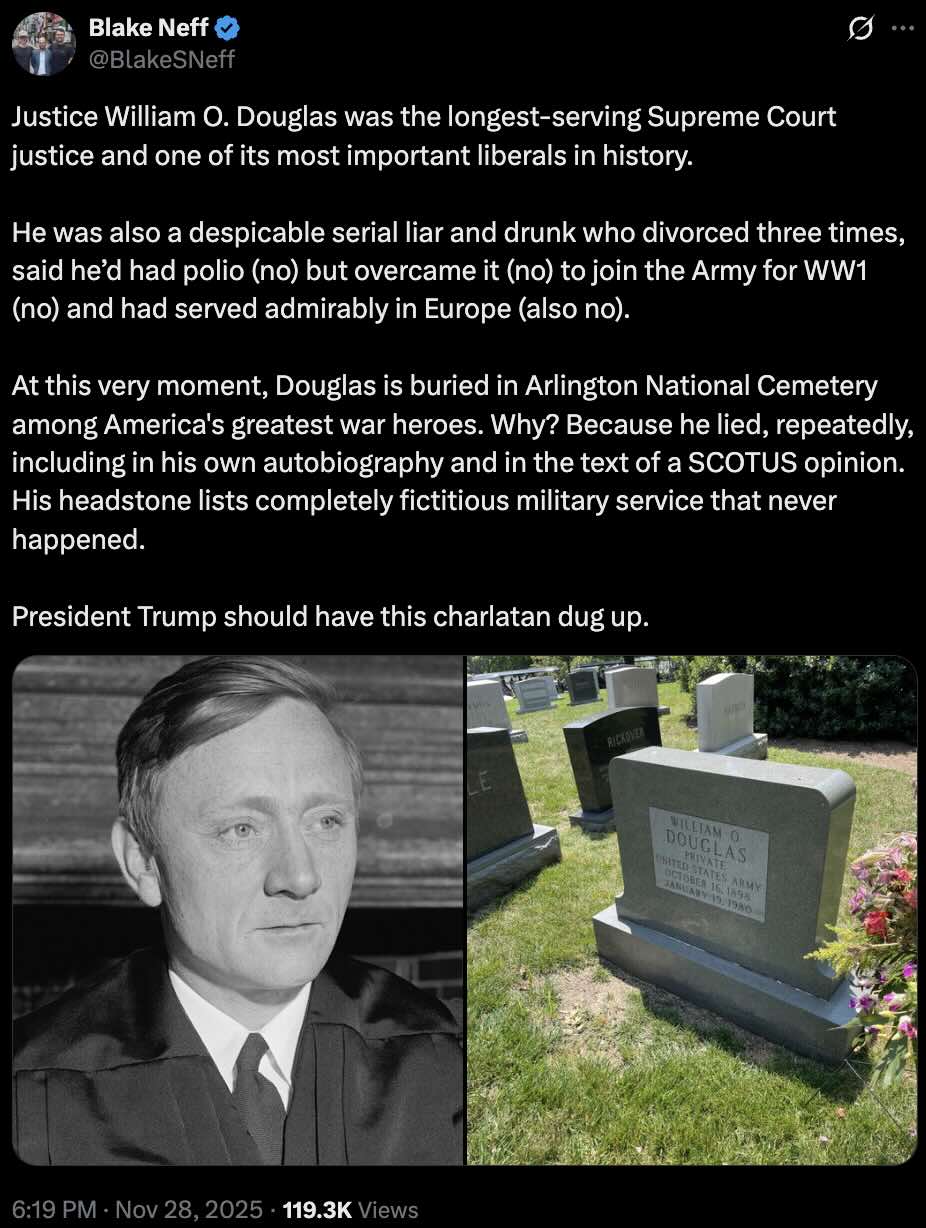 It additionally helps to recollect why Douglas rests eternally in each Arlington Nationwide Cemetery and rent-free in conservative minds. Within the Church of Everlasting Grievance Farming, Douglas occupies a seat of honor. Not simply because the creator of Griswold, however as an architect that introduced environmental plaintiffs into court docket, creating no finish of inconvenience for the donors who fund right-wing summer season camps for conservative authorized luminaries to attend. Douglas’s free speech opinions acknowledged the federal government as one thing to be restrained, not an authority to drive personal actors to guard bigots from being canceled. And he’s the securities regulation knowledgeable who’s spinning in that grave at 50 terahashes per second that we’ve a faux forex economic system pushed by a president with a meme coin. In fact they hate him.