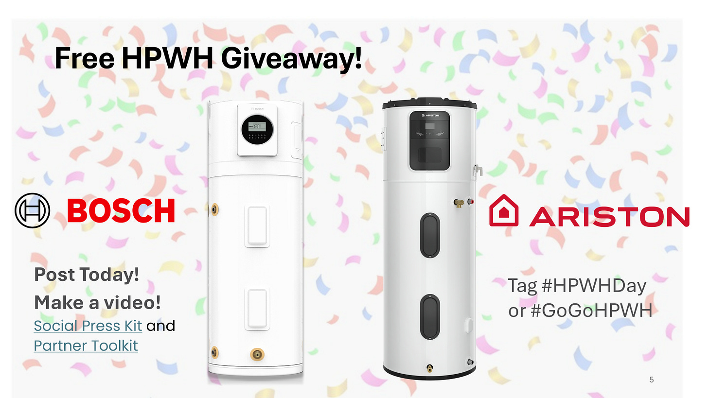 We additionally get the phrase out about HPWHs. This 12 months the theme is “Go Go HPWHs,” speaking about all of the wonderful options on a warmth pump water heater.